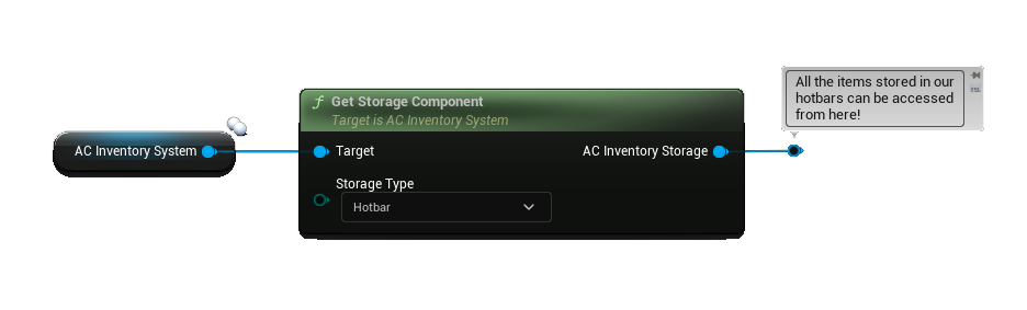 You can get a reference to the storage component for the player hotbar through the AC_InventorySystem component you added to your player controller. From the AC_InventorySystem call the getPlayerStorage function and select Hotbar for the Storage enumeration.