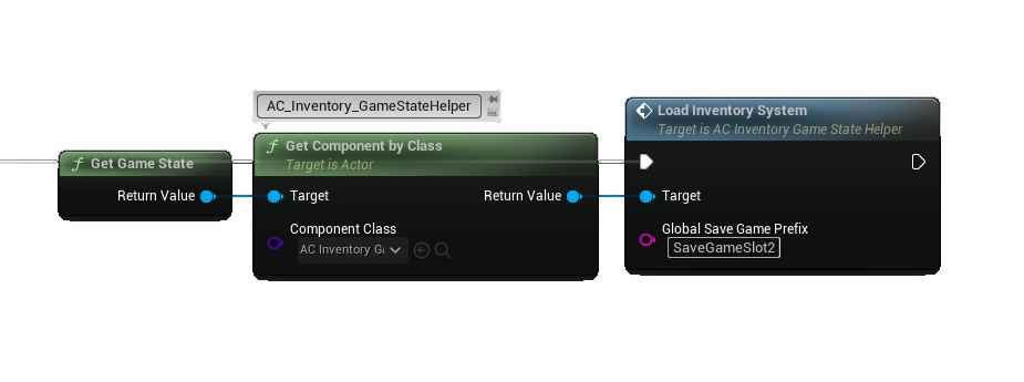 2. To manually load, get a reference to this component on your game state and call loadInventorySystem. Provide your unique save game identifier as the global save game prefix input.