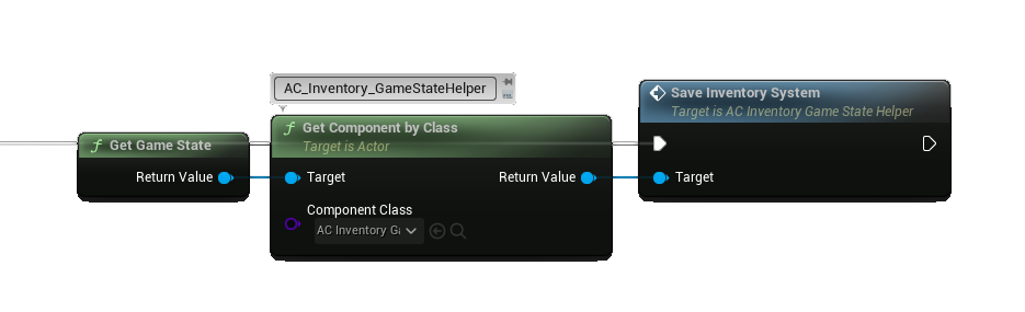 1. Since we save and load automatically by default you will first want to disable that. On the AC_InventorySystem component attached to your player controller set autoLoadStorageOnSetup and autoSaveStorageOnChange to false. These will stop the system from saving and loading automatically, and will leave you with the responsibility to manually control the process.